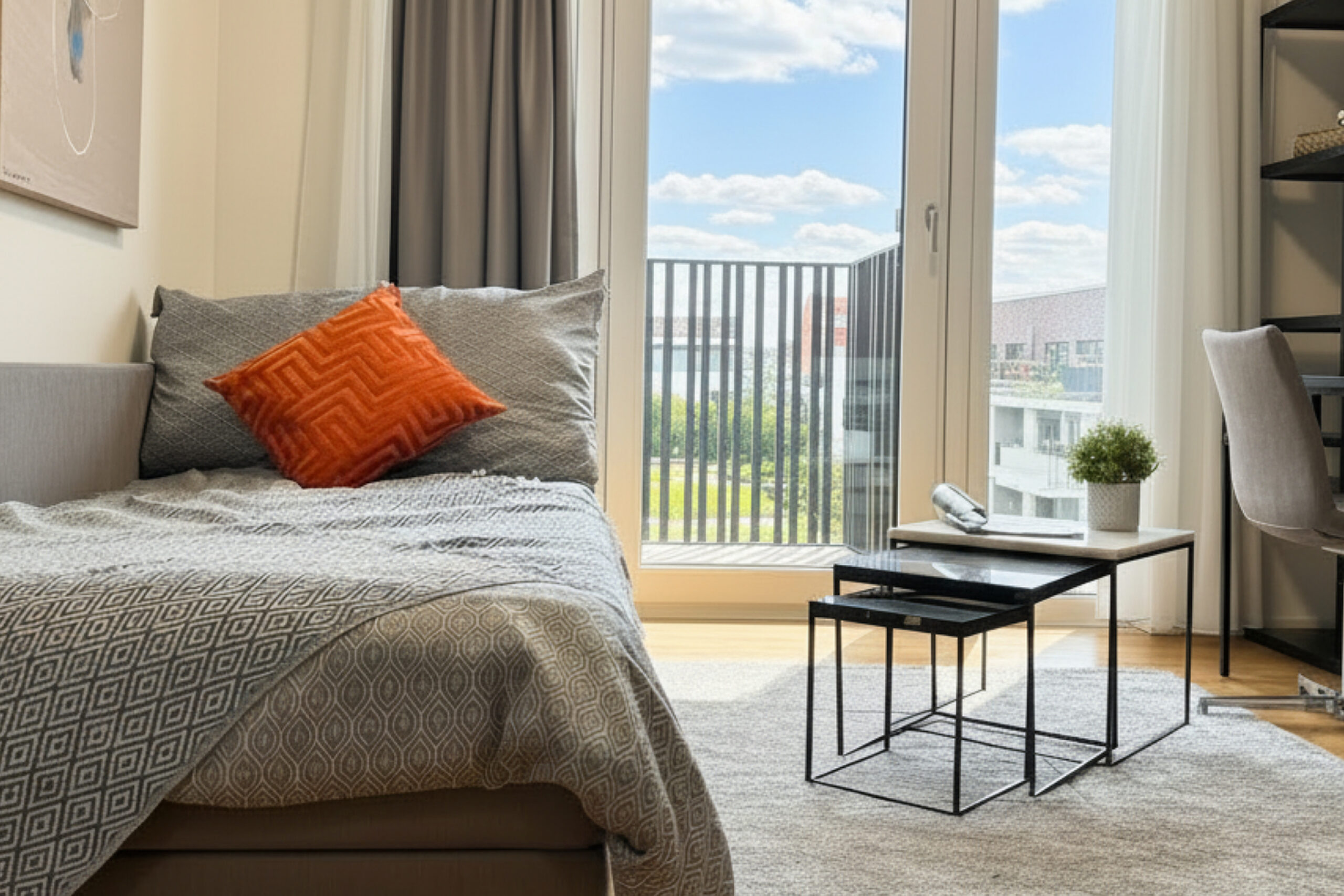 Voll ausgestattetes Erdgeschoss-Apartment mit Balkon zur Straßenseite mit Blick auf die Europa City oder den Berliner Nordhafen. All-inklusive Miete.