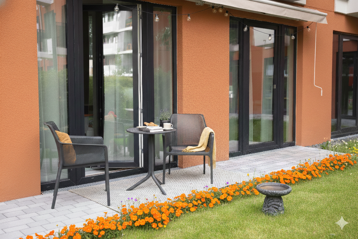 Fully equipped apartment on the garden floor with terrace facing the courtyard. All-inclusive rent.